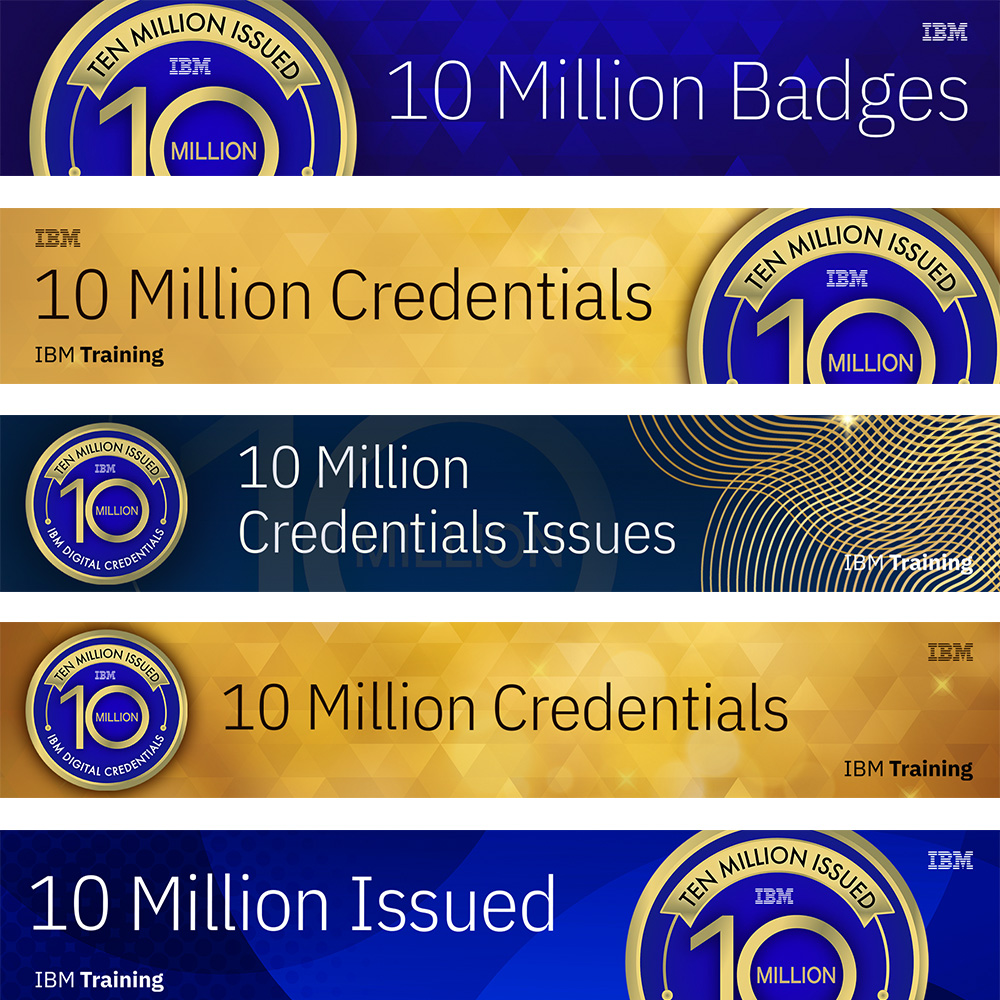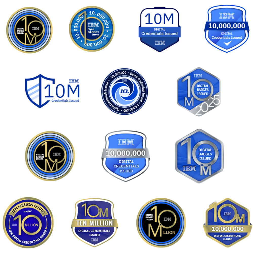 I was tasked with developing a site-wide badge to be issued for all IBM promotions related to credential achievements. The three-month design process involved extensive collaboration and feedback across multiple stakeholder groups. The first image represents the final selected badge, followed by the leading contenders, the accompanying social card, promotional banners, and a selection of design iterations that led to the final outcome.
